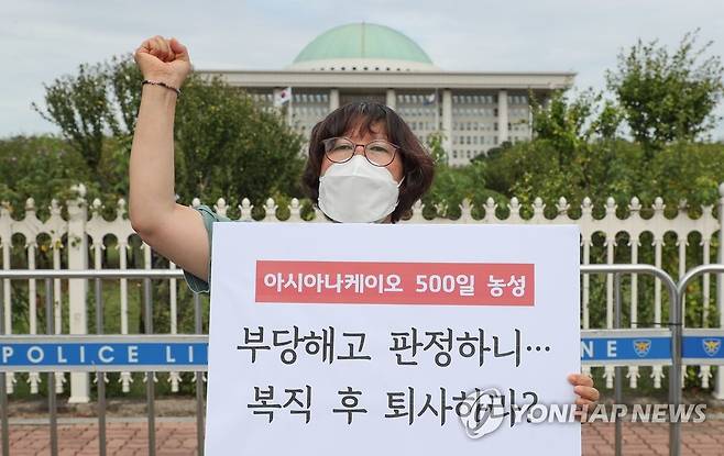 (서울=연합뉴스) 류효림 기자 = 김계월 아시아나케이오 지부장이 27일 오전 서울 여의도 국회 앞에서 열린 아시아나케이오 복직판결 이행 촉구 시민사회 기자회견에서 구호를 외치고 있다. 2021.9.27