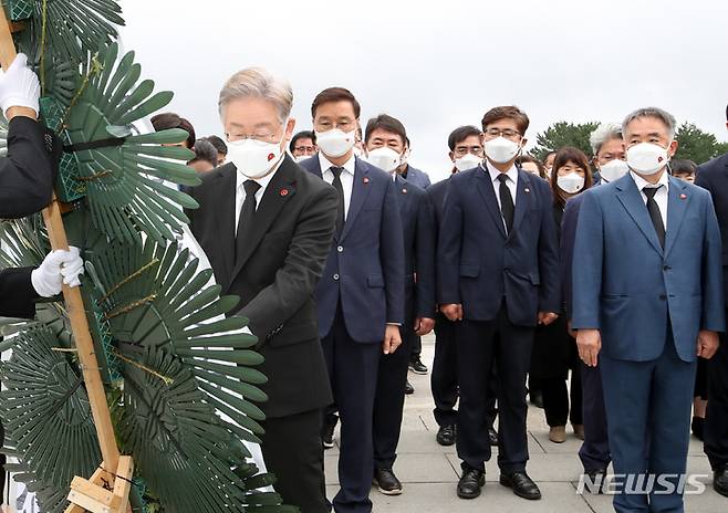 [제주=뉴시스] 우장호 기자 = 더불어민주당 대권주자인 이재명 경기도지사가 27일 오전 제주시 봉개동 제주4·3평화공원을 방문해 희생영령에게 참배하고 있다. 2021.09.27. woo1223@newsis.com