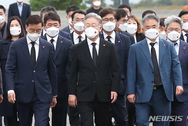 [제주=뉴시스] 우장호 기자 = 더불어민주당 대권주자인 이재명 경기도지사가 27일 오전 제주시 봉개동 제주4·3평화공원을 방문해 희생영령에 참배하기 위해 송재호(제주시갑) 도당위원장 등 관계자들과 이동하고 있다. 2021.09.27. woo1223@newsis.com