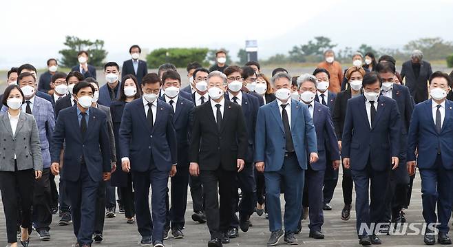 [제주=뉴시스] 우장호 기자 = 더불어민주당 대권주자인 이재명 경기도지사가 27일 오전 제주시 봉개동 제주4·3평화공원을 방문해 희생영령에 참배하기 위해 송재호(제주시갑) 도당위원장 등 관계자들과 이동하고 있다. 2021.09.27. woo1223@newsis.com