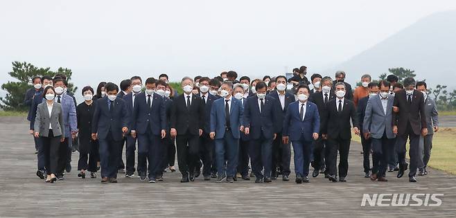 [제주=뉴시스] 우장호 기자 = 더불어민주당 대권주자인 이재명 경기도지사가 27일 오전 제주시 봉개동 제주4·3평화공원을 방문해 희생영령에 참배하기 위해 송재호(제주시갑) 도당위원장 등 관계자들과 이동하고 있다. 2021.09.27. woo1223@newsis.com