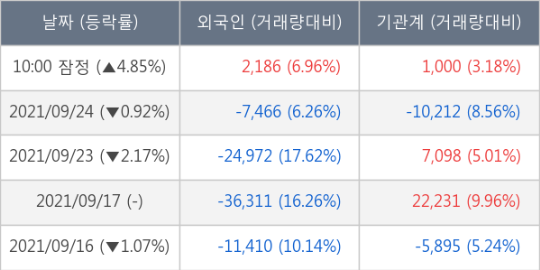 10시 00분 잠정집계에 따르면, 하이브는 외국인과 기관이 각각 2,186주, 1,000주를 순매수 중이다.