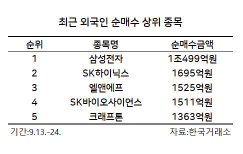 외국인의 투심은 최근 반도체 업황에 대한 불안심리가 다소 진정되면서 살아난 것으로 풀이된다. 이 연구원은 “연말 소비시즌에 대한 기대와 이를 앞두고 재고축적 수요 모멘텀이 반영된 것”이라고 설명했다.