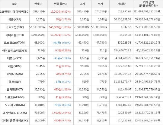 가상화폐 시세 (제공: 암호화폐 거래소 업비트)현재 암호화폐 거래소 "업비트"에 따르면 가상화폐 대장 격인 비트코인의 시세는 전일 대비 545,000원(1.03%) 상승한 53,343,000원에 거래되고 있다.