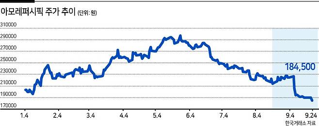 27일 한국거래소에 따르면 아모레퍼시픽 주가는 추락세를 면치 못하고 있다. 지난 5월 30만원까지 치솟았던 주가는 지난 24일 기준 18만원대에서 거래되고 있다. 약 4개월 새 40% 가까이 폭락한 셈이다.
