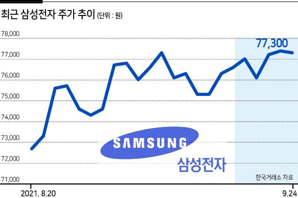 외국인 자금에 힘입어 삼성전자 주가도 최근 좋은 흐름을 보이고 있다. 지난달 20일 7만2000원선까지 하락했던 주가는 최근 7만7000원선을 회복했다.