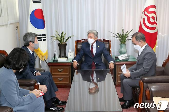 (서울=뉴스1) 황기선 기자 = 이인영 통일부장관이 27일 오전 서울 종로구 천도교 중앙총부를 방문해 송범두 교령과 면담을 하고 있다. 2021.9.27/뉴스1