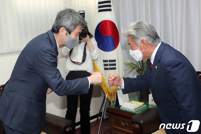 (서울=뉴스1) 황기선 기자 = 이인영 통일부장관이 27일 오전 서울 종로구 천도교 중앙총부를 방문해 송범두 교령과 주먹인사를 나누고 있다. 2021.9.27/뉴스1