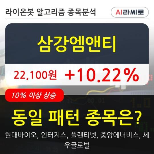 이 시각 거래소에서 삼강엠앤티 이외에도 현대바이오(10.28%), 인터지스(10.26%), 플랜티넷(12.44%), 중앙에너비스(18.91%), 세우글로벌(29.96%) 등이 상승세를 보이고 있다.