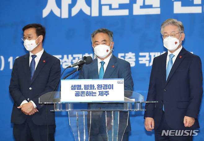 [제주=뉴시스] 우장호 기자 = 더불어민주당 송재호(제주시갑)의원이 27일 오전 제주상공회의소 5층 국제회의장에서 열린 이재명 대선 경선 후보 기자간담회에 앞서 인사말을 하고 있다. 2021.09.27. woo1223@newsis.com