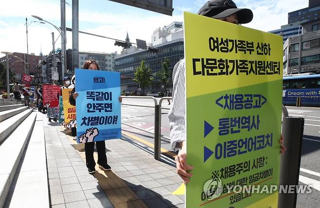 (서울=연합뉴스) 이재희 기자 = 27일 오전 서울 중구 국가인권위원회 앞에서 차별금지법제정연대 관계자 및 이주노동자들이 '공공기관 이주여성노동자 평등임금' 기자회견을 마친 뒤 행진하고 있다. 2021.9.27