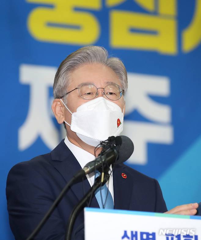 [제주=뉴시스] 우장호 기자 = 더불어민주당 대권주자인 이재명 경기도지사가 27일 오전 제주상공회의소 5층 국제회의장에서 제주 발전 공약 발표 기자회견을 하고 있다. 2021.09.27. woo1223@newsis.com