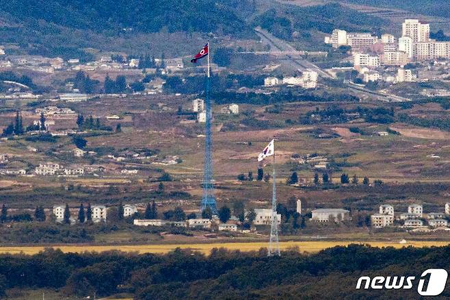 사진은 27일 오전 파주 접경지역에서 바라본 비무장지대(DMZ) 북한 기정동 마을의 인공기와 남한 대성동 마을의 태극기가 나란히 펄럭이는 모습. 2021.9.27/뉴스1