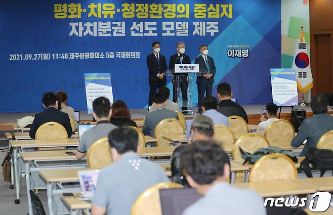 (제주=뉴스1) 오현지 기자 = 더불어민주당 대권 주자인 이재명 경기도지사가 27일 오전 제주상공회의소 국제회의장에서 제주지역 공약을 발표하고 있다. 2021.9.27/뉴스1