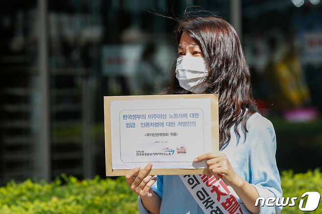 (서울=뉴스1) 안은나 기자 = 한가은 한국이주여성인권센터 사무국장이 27일 서울 중구 국가인권위원회 앞에서 공공기관 이주여성 노동자 평등임금 기자회견을 마친 뒤 인권위에 접수할 진정서를 들고 있다. 공공운수노조, 차별금지법제정연대는 공공기관 근무 상담·통번역·이중언어 관련 이주여성 노동자 실태조사 결과 응답자의 86.8%가 급여의 차별이 있다고 응답한 것과 관련, 이주여성에 대한 인종차별을 중단하라며 정부서울청사, 청와대까지 행진했다. 2021.9.27/뉴스1
