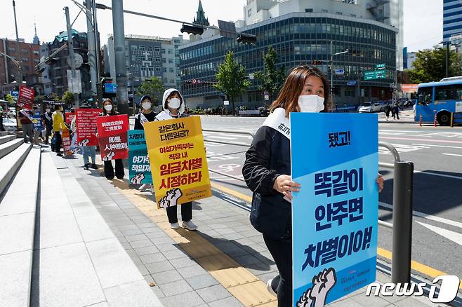 (서울=뉴스1) 안은나 기자 = 27일 서울 중구 국가인권위원회 앞에서 공공기관 이주여성 노동자 평등임금 기자회견을 마친 참가자들이 정부서울청사와 청와대를 향해 행진하고 있다. 공공운수노조, 차별금지법제정연대 등은 공공기관 근무 상담·통번역·이중언어 관련 이주여성 노동자 실태조사 결과 응답자의 86.8%가 급여의 차별이 있다고 응답한 것과 관련, 이주여성에 대한 인종차별을 중단하라며 인권위에 차별진정을 접수했다. 2021.9.27/뉴스1
