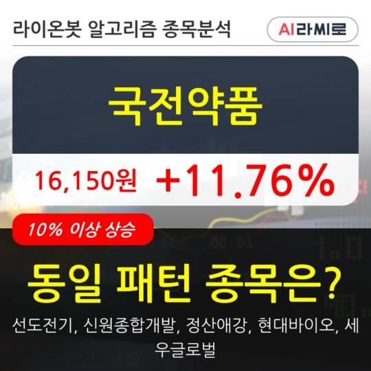 이 시각 거래소에서 국전약품 이외에도 선도전기(14.85%), 신원종합개발(16.32%), 정산애강(10.36%), 현대바이오(11.15%), 세우글로벌(29.96%) 등이 상승세를 보이고 있다.