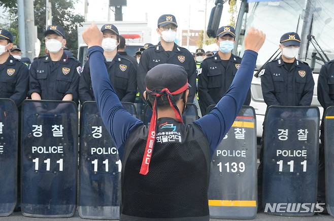 [청주=뉴시스] 조성현 기자 = 민주노총 공공운수노조 화물연대가 27일 오전 충북 청주시 흥덕구 송절동 SPC삼립 청주공장 인근에서 경찰과 대치하고 있다. 2021.09.27. jsh0128@newsis.com