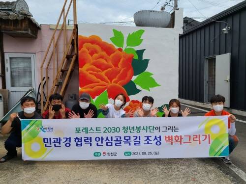 경남 합천군(군수 문준희)은 25일 초계면 일원 골목길에 '민관경 협력 안심골목길 조성사업'으로 2030 청년자원봉사단(회장 최재황) 20여 명이 재능기부로 참여해 벽화그리기를 실시했다고 전했다.