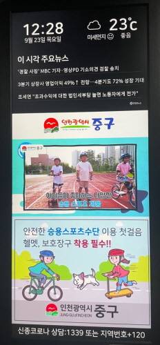인천 중구(구청장 홍인성)는 어린이 안전사고 예방을 위해 홍보동영상 '어린이 승용스포츠 제품 안전하게 이용해요'를 9월부터 12월까지 관내 공동주택 엘리베이터 모니터(29개 단지, 272대)와 시내버스 내 모니터(4개 노선, 104대)를 통해 송출한다.