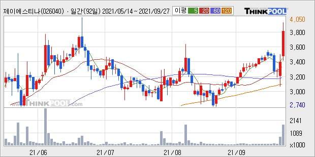'제이에스티나' 52주 신고가 경신, 단기·중기 이평선 정배열로 상승세