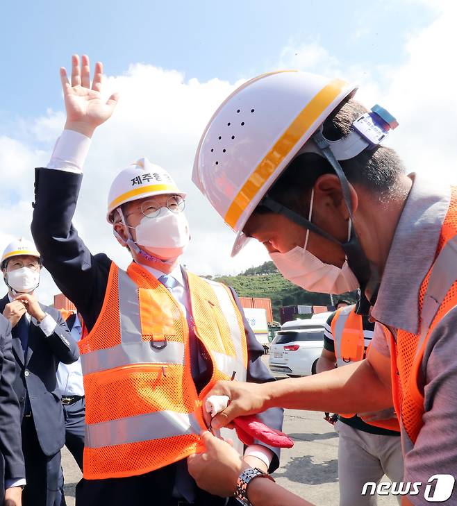 (제주=뉴스1) 오현지 기자 = 더불어민주당 대권 주자인 이재명 경기도지사가 27일 오후 제주시 건입동 제주항 6부두에서 여객선 승객에게 인사하고 있다. 2021.9.27/뉴스1