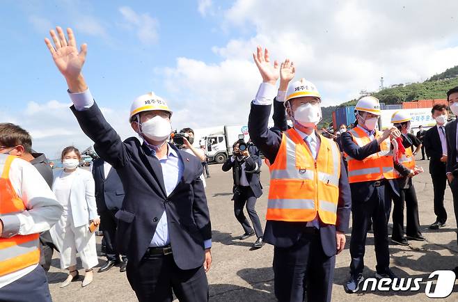 (제주=뉴스1) 오현지 기자 = 더불어민주당 대권 주자인 이재명 경기도지사가 27일 오후 제주시 건입동 제주항 6부두에서 여객선 승객에게 인사하고 있다. 2021.9.27/뉴스1