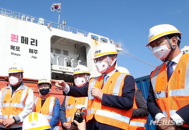 [제주=뉴시스] 우장호 기자 = 더불어민주당 대권주자인 이재명 경기도지사가 27일 오후 제주시 건입동 제주항 6부두 물류시스템을 둘러 보고 있다. 2021.09.27. woo1223@newsis.com