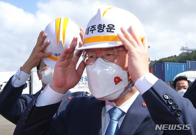 [제주=뉴시스] 우장호 기자 = 더불어민주당 대권주자인 이재명 경기도지사가 27일 오후 제주시 건입동 제주항 6부두를 방문해 안전모를 착용하고 있다. 2021.09.27. woo1223@newsis.com