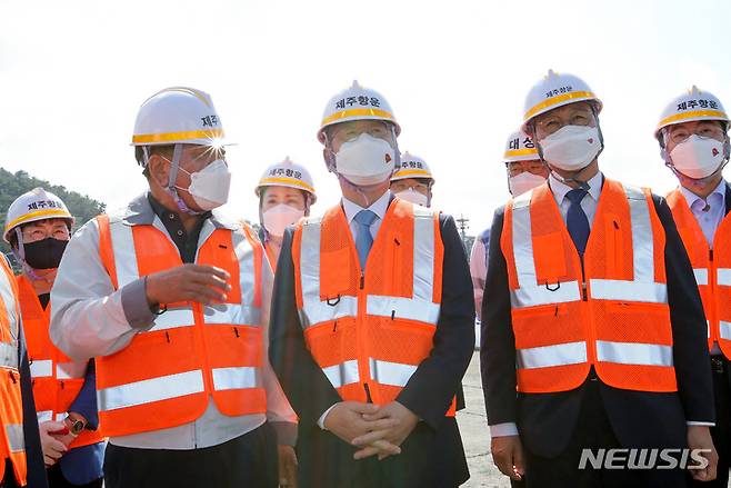 [제주=뉴시스] 우장호 기자 = 더불어민주당 대권주자인 이재명 경기도지사가 27일 오후 제주시 건입동 제주항 6부두 물류시스템을 둘러 보고 있다. 2021.09.27. woo1223@newsis.com