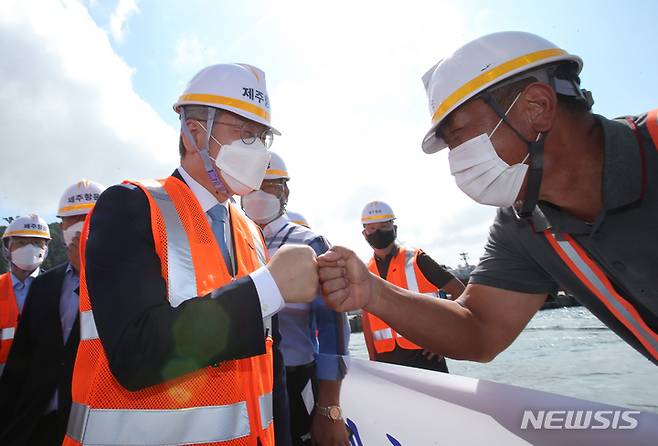 [제주=뉴시스] 우장호 기자 = 더불어민주당 대권주자인 이재명 경기도지사가 27일 오후 제주시 건입동 제주항 6부두를 방문해 관계자들과 주먹 인사를 나누고 있다. 2021.09.27. woo1223@newsis.com
