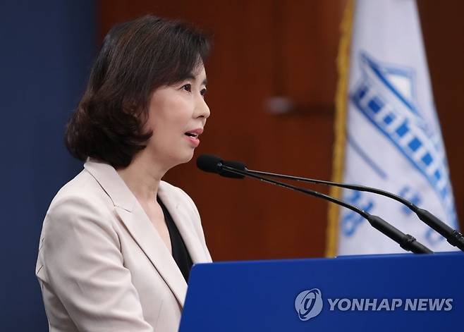 (서울=연합뉴스) 최재구 기자 = 박경미 청와대 대변인이 27일 청와대 춘추관에서 주례회동 관련 브리핑을 하고 있다. 2021.9.27