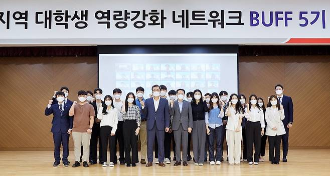 (부산=연합뉴스) 27일 부산국제금융센터(BIFC) 내 캠코마루에서 열린 '부산지역 대학생 역량강화 네트워크'(BUFF) 5기 발대식에서 문성유 캠코 사장과 학생 대표, 멘토단 등 참석자들이 기념 촬영하고 있다. 2021.9.27