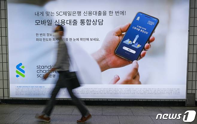 27일 서울시내 지하철역에 걸린 시중은행 대출광고 앞을 시민들이 지나고 있다.