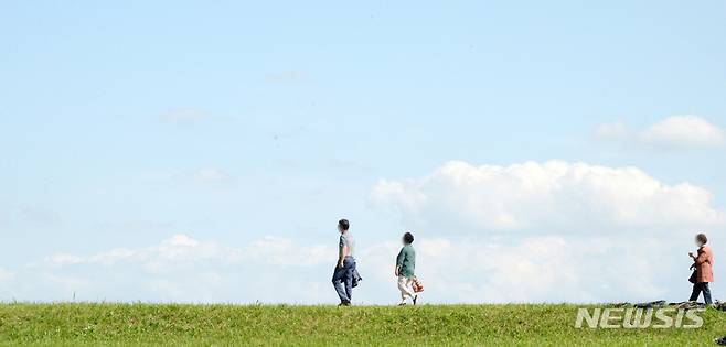 [김제=뉴시스] 김얼 기자 = 완연한 가을 날씨가 이어지고 있는 27일 전북 김제시 벽골제 제방을 지나는 관광객들 뒤로 가을과 어울리는 푸른 하늘이 펼쳐져 있다. 2021.09.27. pmkeul@newsis.com