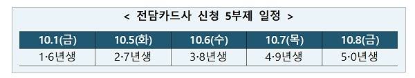 9개 카드사 중 하나를 전담카드사로 지정해 상생소비지원금 프로그램 참여 신청을 하면 된다. 다음 달 1일부터 첫 1주일간은 출생연도 뒷자리에 따라 5부제로 운영하고 이후는 출생연도에 관계없이 사업기간 전체에 걸쳐 신청이 가능하다.