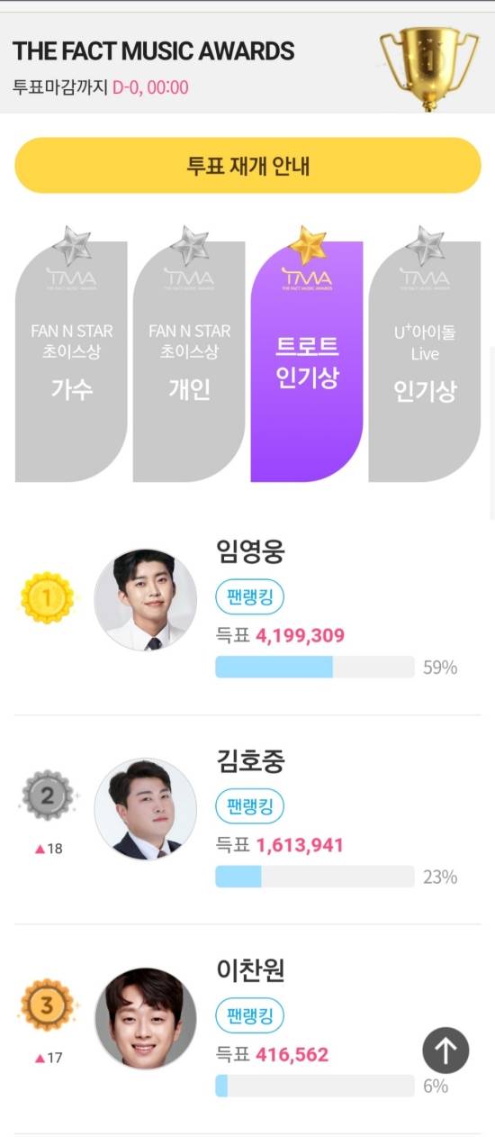 임영웅은 트로트 인기상 부문에서 4,199,309표를 받아 1위에 올랐다. 지지율은 59%