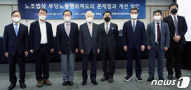 (서울=뉴스1) 박정호 기자 = 손경식 한국경영자총협회(이하 경총) 회장이 27일 오후 서울 중구 세종대로 한국프레스센터에서 열린 노조법상 부당노동행위제도의 문제점과 개선 방안 토론회에서 발제 및 토론자 등과 기념촬영을 하고 있다. 2021.9.27/뉴스1