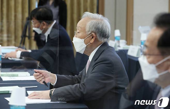 (서울=뉴스1) 박정호 기자 = 손경식 한국경영자총협회(이하 경총) 회장이 27일 오후 서울 중구 세종대로 한국프레스센터에서 열린 노조법상 부당노동행위제도의 문제점과 개선 방안 토론회에 참석해 이정 한국외국어대학교 법학전문대학원 교수의 발제를 듣고 있다. 2021.9.27/뉴스1