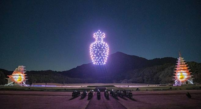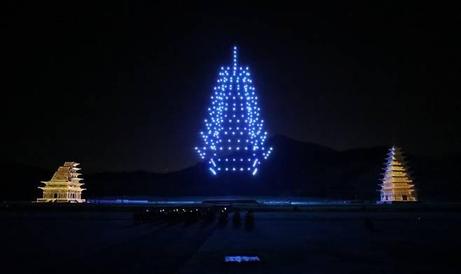 4회에 걸쳐 진행되고 있는 드론쇼는 250대의 드론을 이용해 현재 현장 복원이 어려운 목탑을 처음으로 가상복원, 1400년 전 삼국시대 최대가람 미륵사의 3탑(동탑-목탑-서탑)의 모습을 구현해냈다.
