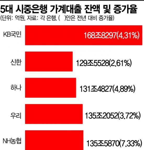 [아시아경제 이광호 기자]NH농협·하나은행에 이어 KB국민은행도 가계 대출 한도를 대폭 축소한다. 가계대출 증가율이 금융당국의 올해 관리 목표치인 연 5∼6%에 육박해 대출 창구가 아예 닫힐 위기에 처해서다. 5대 은행 중 3곳에서 대출 절벽이 현실화되면서 아직 여유가 있는 신한·우리은행으로 풍선효과가 나타날 가능성도 농후해졌다. 은행들의 도미노 대출 중단 가능성에 2금융권까지 대출 옥죄기가 예고되면서 결혼과 이사를 앞둔 실수요자들의 분통과 반발은 더욱 거세질 전망이다.