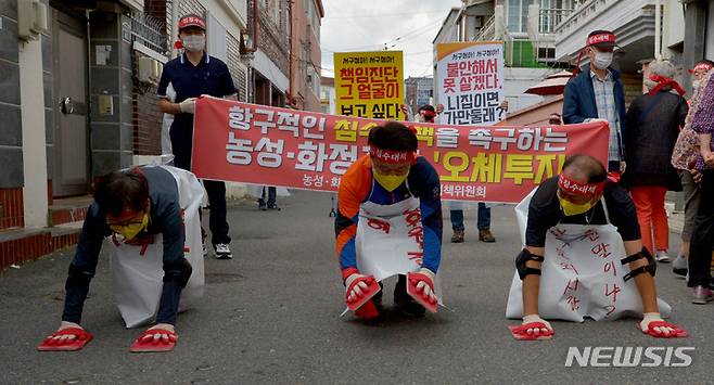 [광주=뉴시스] 변재훈 기자 = 광주 농성·화정동 침수 피해 주민대책위(주민대책위) 소속 주민들이 27일 광주 서구 농성동 상습 침수 주택가에서 항구적 수해 예방 대책을 촉구하며 오체투지 행진을 벌이고 있다. 이들은 침수 주택가부터 부터 서구청 광장까지 1.2㎞를 5보1배 형식으로 걸으며 행진했다. 2021.09.27. wisdom21@newsis.com