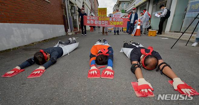 [광주=뉴시스] 변재훈 기자 = 광주 농성·화정동 침수 피해 주민대책위(주민대책위) 소속 주민들이 27일 광주 서구 농성동 상습 침수 주택가에서 항구적 수해 예방 대책을 촉구하며 오체투지 행진을 벌이고 있다. 이들은 침수 주택가부터 부터 서구청 광장까지 1.2㎞를 5보1배 형식으로 걸으며 행진했다. 2021.09.27. wisdom21@newsis.com
