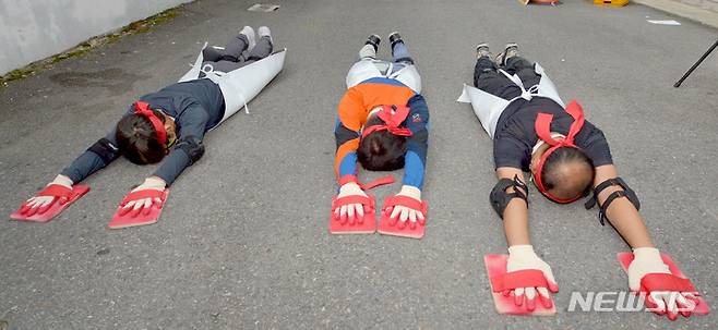 [광주=뉴시스] 변재훈 기자 = 광주 농성·화정동 침수 피해 주민대책위(주민대책위) 소속 주민들이 27일 광주 서구 농성동 상습 침수 주택가에서 항구적 수해 예방 대책을 촉구하며 오체투지 행진을 벌이고 있다. 이들은 침수 주택가부터 부터 서구청 광장까지 1.2㎞를 5보1배 형식으로 걸으며 행진했다. 2021.09.27. wisdom21@newsis.com