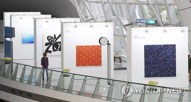 (영종도=연합뉴스) 임헌정 기자 = 27일 영종도 인천국제공항 제1교통센터에서 시민들이 미술 작품을 감상하고 있다.