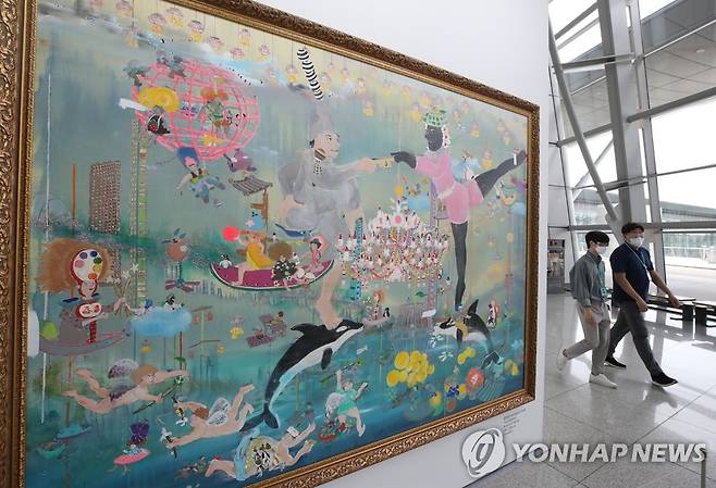 (영종도=연합뉴스) 임헌정 기자 = 27일 영종도 인천국제공항 제1교통센터에서 시민들이 미술 작품을 감상하고 있다.