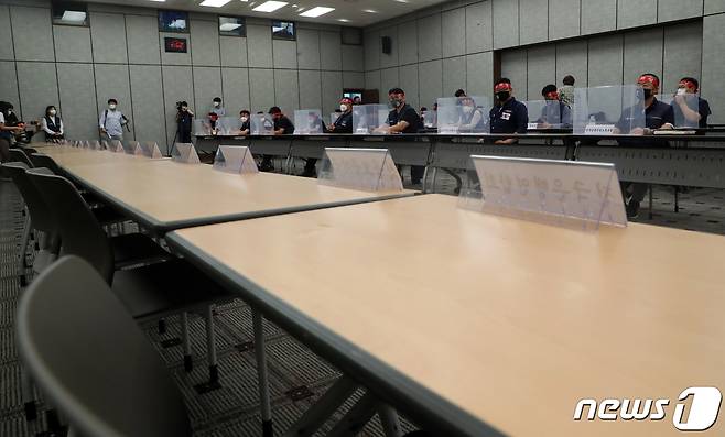 (서울=뉴스1) 황기선 기자 = 전국금융산업노동조합원들이 27일 오후 서울 중구 은행회관 국제회의실에서 열린 '2021년 산별중앙교섭 및 중앙노사위원회 1차 공동교섭'에서 사용자협의회 대표의 참석을 기다리고 있다.