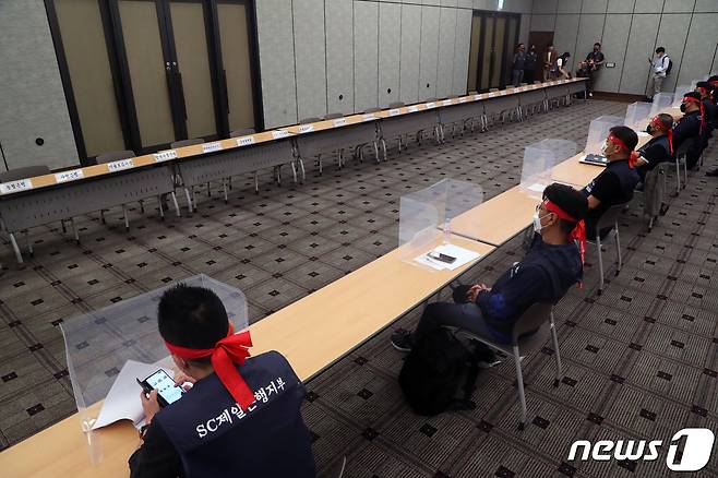 (서울=뉴스1) 황기선 기자 = 전국금융산업노동조합원들이 27일 오후 서울 중구 은행회관 국제회의실에서 열린 '2021년 산별중앙교섭 및 중앙노사위원회 1차 공동교섭'에서 사용자협의회 대표의 참석을 기다리고 있다.