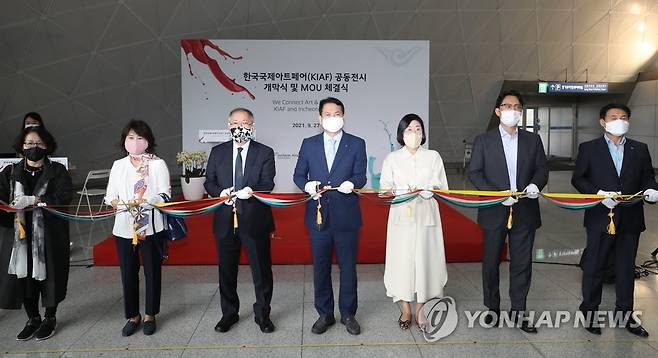 (영종도=연합뉴스) 임헌정 기자 = 김경욱 인천국제공항공사 사장(가운데)이 27일 영종도 인천국제공항 제1교통센터에서 열린 '한국국제아트페어(KIAF·키아프) 특별전시' 개막식에서 테이프 커팅을 하고 있다. 2021.9.27