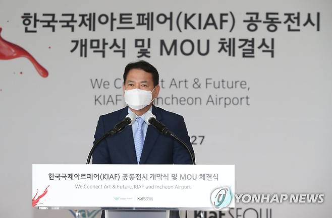 (영종도=연합뉴스) 임헌정 기자 = 김경욱 인천국제공항공사 사장이 27일 영종도 인천국제공항 제1교통센터에서 열린 '한국국제아트페어(KIAF·키아프) 특별전시' 개막식에서 인사말을 하고 있다. 2021.9.27